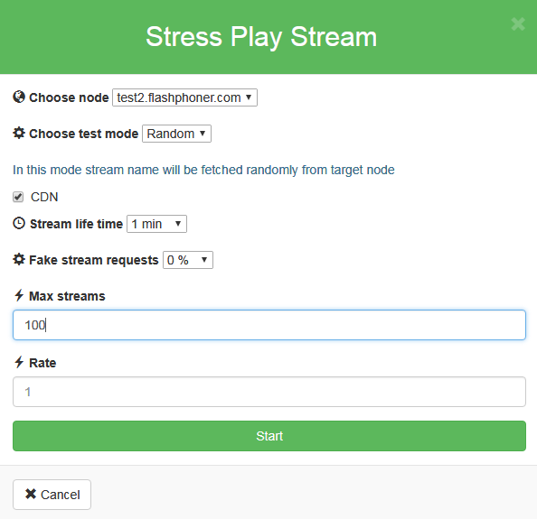 7. Select demo.flashphoner.com server in Console application, press Stress play stream, set the following test parameters: