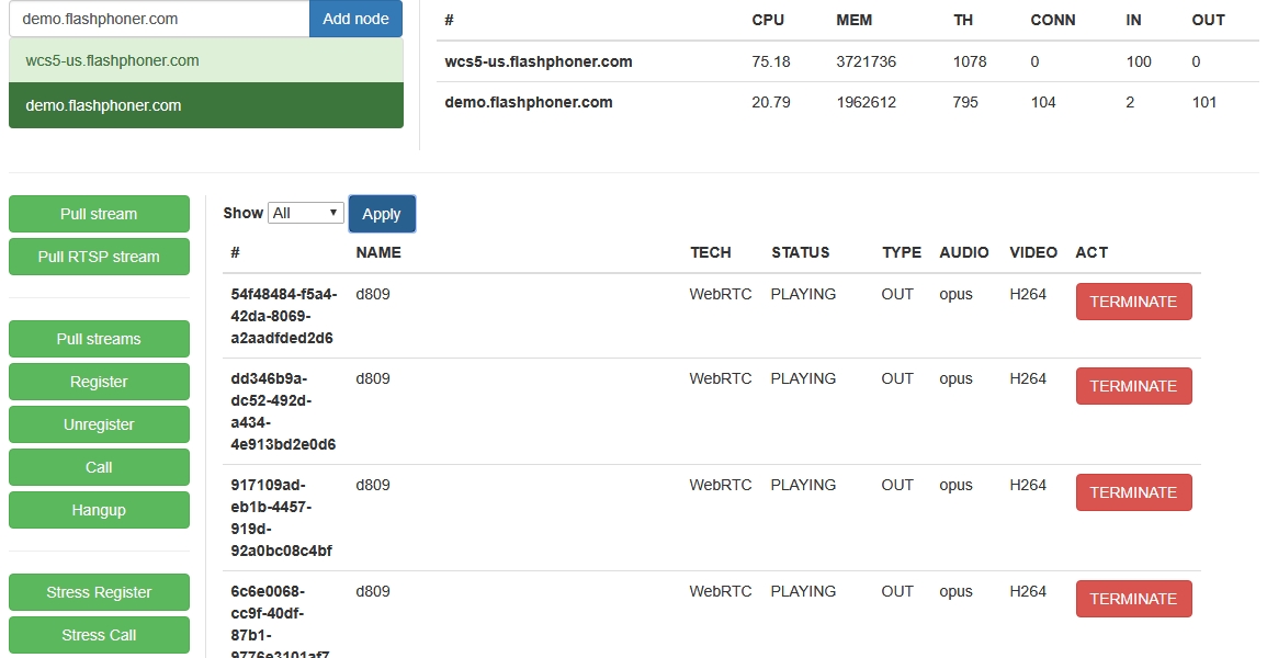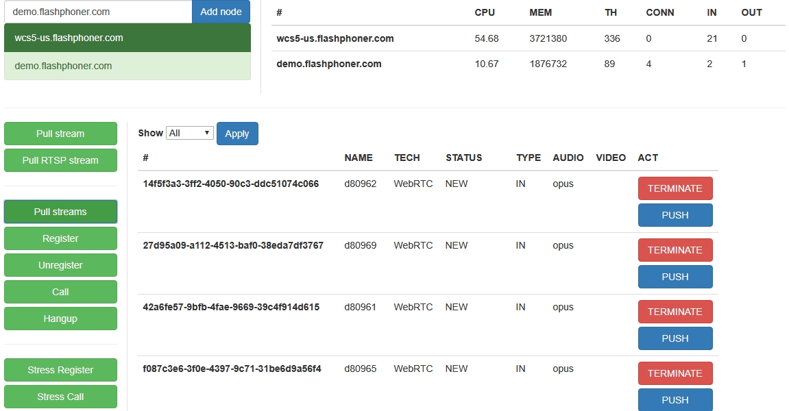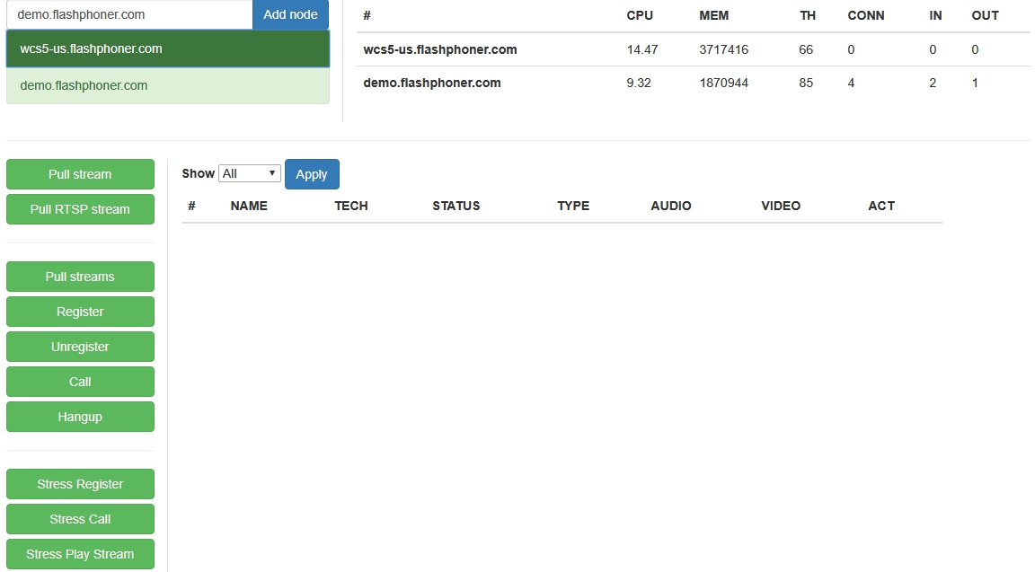 • two WCS servers: demo.flashphoner.com and wcs5-us.flashphoner.com;
