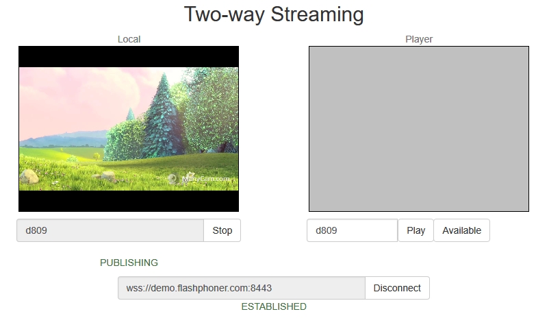 5. Open Two Way Streaming application https://demo.flashphoner.com/client2/examples/demo/streaming/two_way_streaming/two_way_streaming.html, then publish the stream from web camera