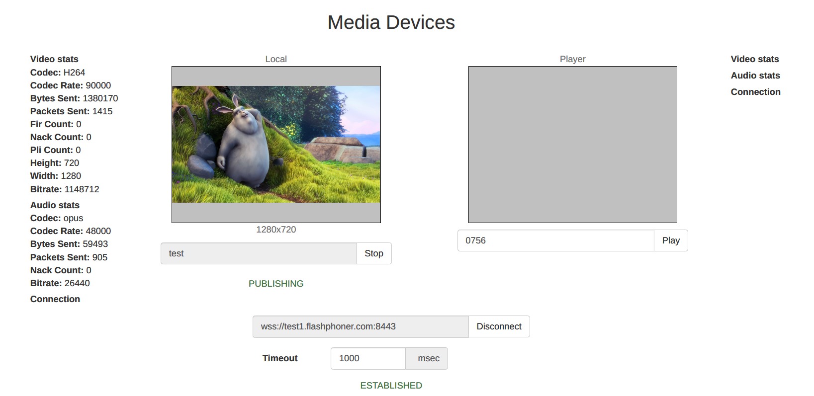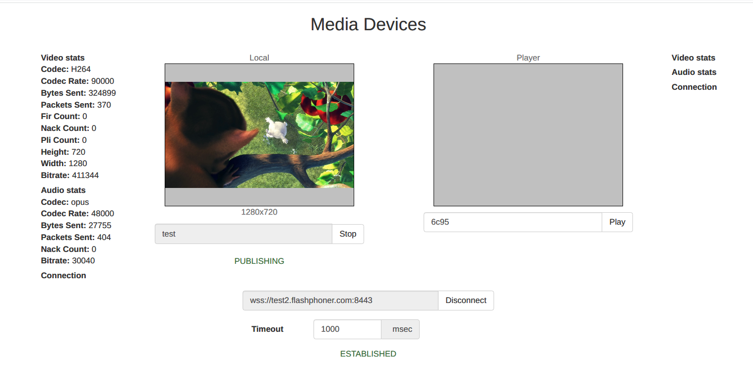 test1.flashphoner.com- WCS server to testtest2.flashphoner.com- WCS server to perform the test- Media Devices example to publish a source stream