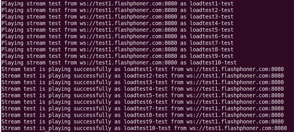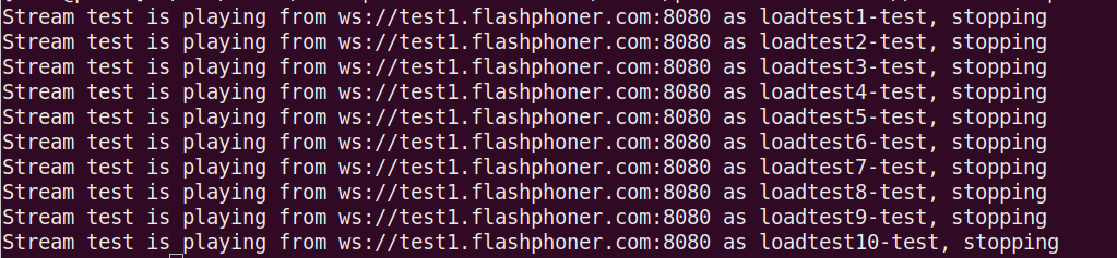 Where:/usr/local/FlashphonerWebCallServer/tools/pullStreams.sh ws://test1.flashphoner.com:8080 http://test1.flashphoner.com:8081 loadtest 10ws://test1.flashphoner.com:8080- tested server websocket URLhttp://test1.flashphoner.com:8081- HTTP REST API URL of the tested serverloadtest- the name prefix used to pull streams from the tested server10- subscribers count
