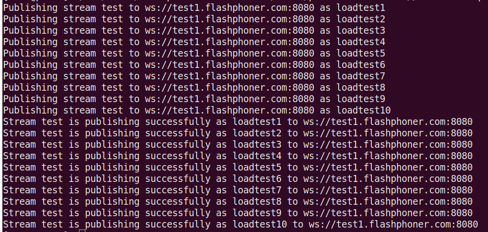Where:/usr/local/FlashphonerWebCallServer/tools/pushStreams.sh ws://test1.flashphoner.com:8080 http://test1.flashphoner.com:8081 test loadtest 10ws://test1.flashphoner.com:8080- websocket URL of the server to testhttp://test1.flashphoner.com:8081- HTTP REST API URL of the server to testtest- the source stream published to the testing nameloadtest- the name prefix used to publish streams to the server to test10- publishers count