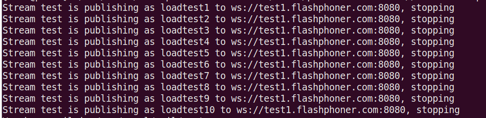 Where:/usr/local/FlashphonerWebCallServer/tools/pushStreams.sh ws://test1.flashphoner.com:8080 http://test1.flashphoner.com:8081 test loadtest stopws://test1.flashphoner.com:8080- tested server websocket URLhttp://test1.flashphoner.com:8081- HTTP REST API URL of the tested servertest- the source stream name published to the tested serverloadtest- the name prefix used to publish streams to the tested serverstop- keyword to stop the publishers with the parameters above