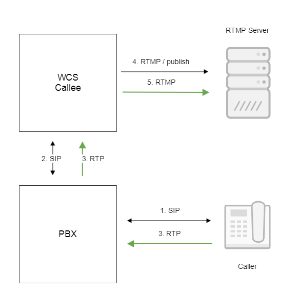 To do this, WCS should be configured with SIP trunks as SIP callee. Then WCS waits for incoming calls from PBX. When SIP call is established, a stream is created from SIP call and republished to target RTMP server. When call is finished, stream is stopped.