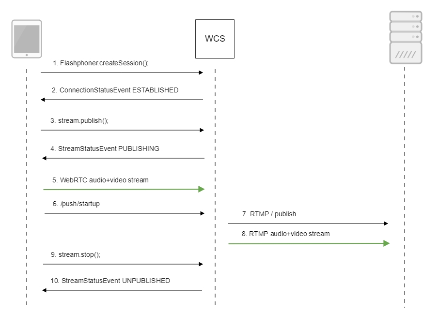 /push/startupquery from the browser. - The WCS server publishes the RTMP stream on the RTMP server at the URL specified in the query.