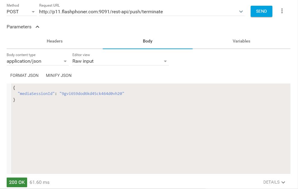 Send the /push/terminate query to the WCS server and specify the identifier of the session in the mediaSessionId parameter of the query: