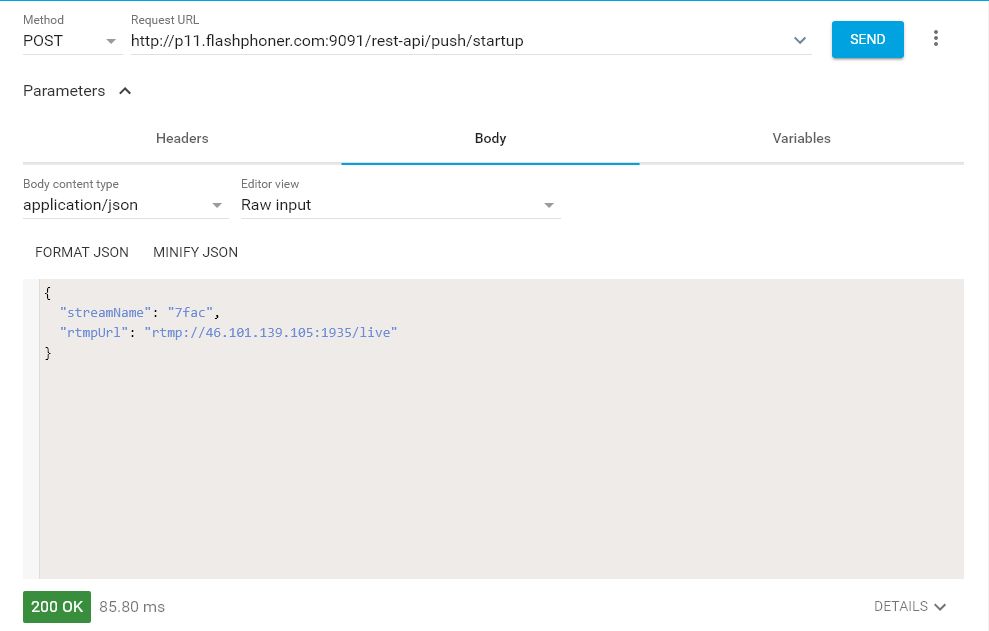 Open the REST client. Send the /push/startup query to the WCS server and specify the identifier of the broadcast in the streamName parameter and the URL of the Wowza server in the rtmpUrl parameter: