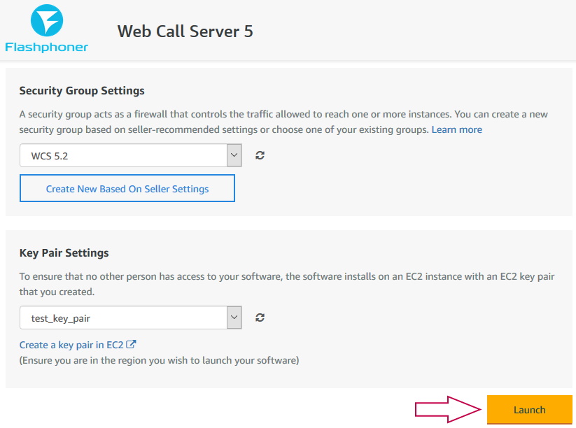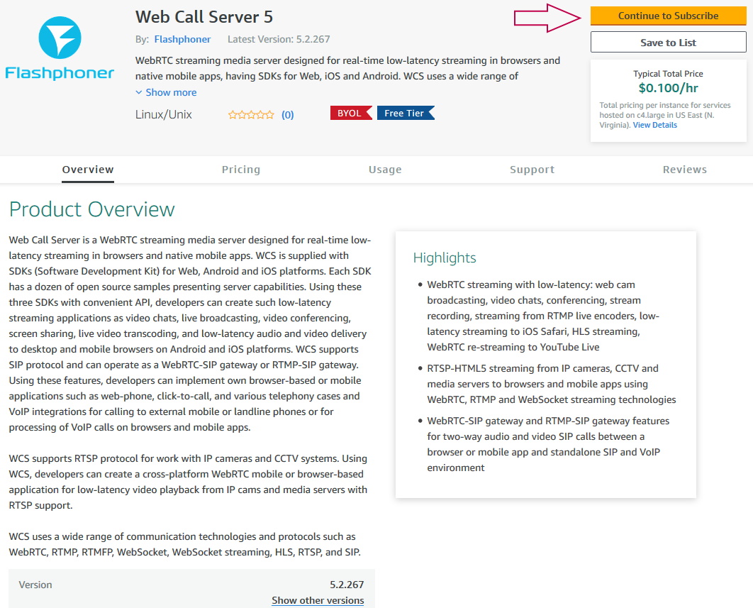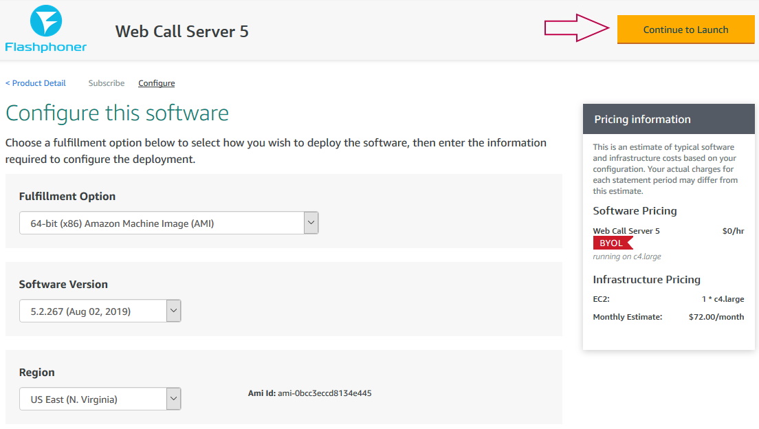 Open Web Call Server page on Amazon AWS Marketplace and click