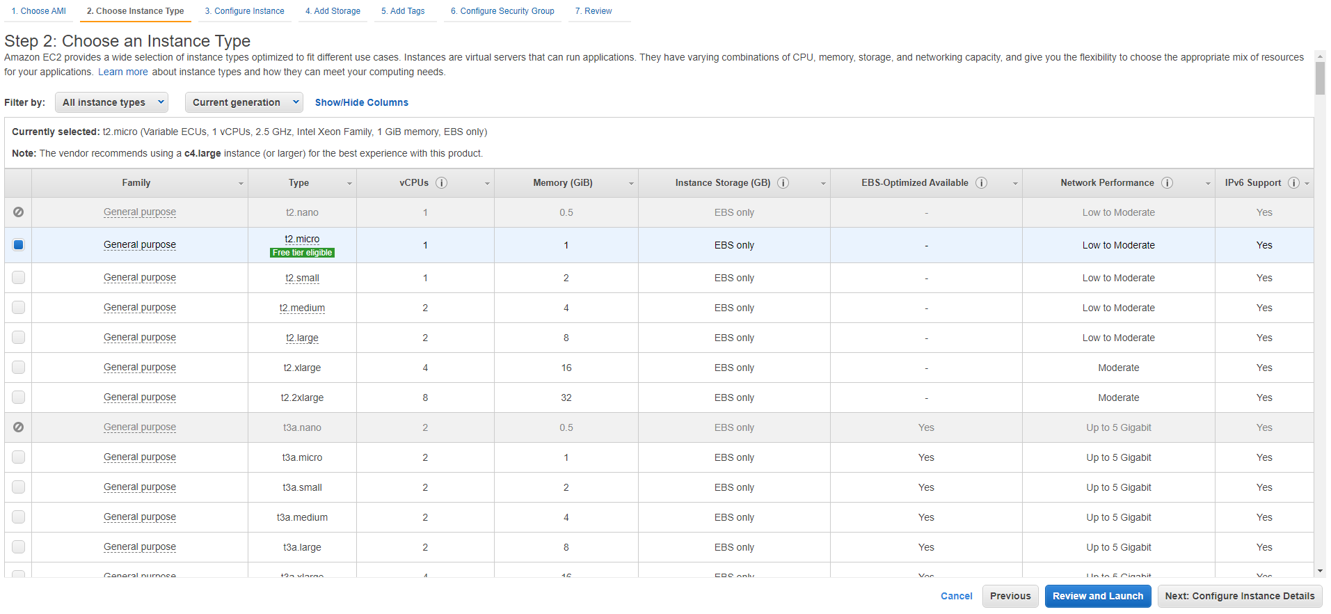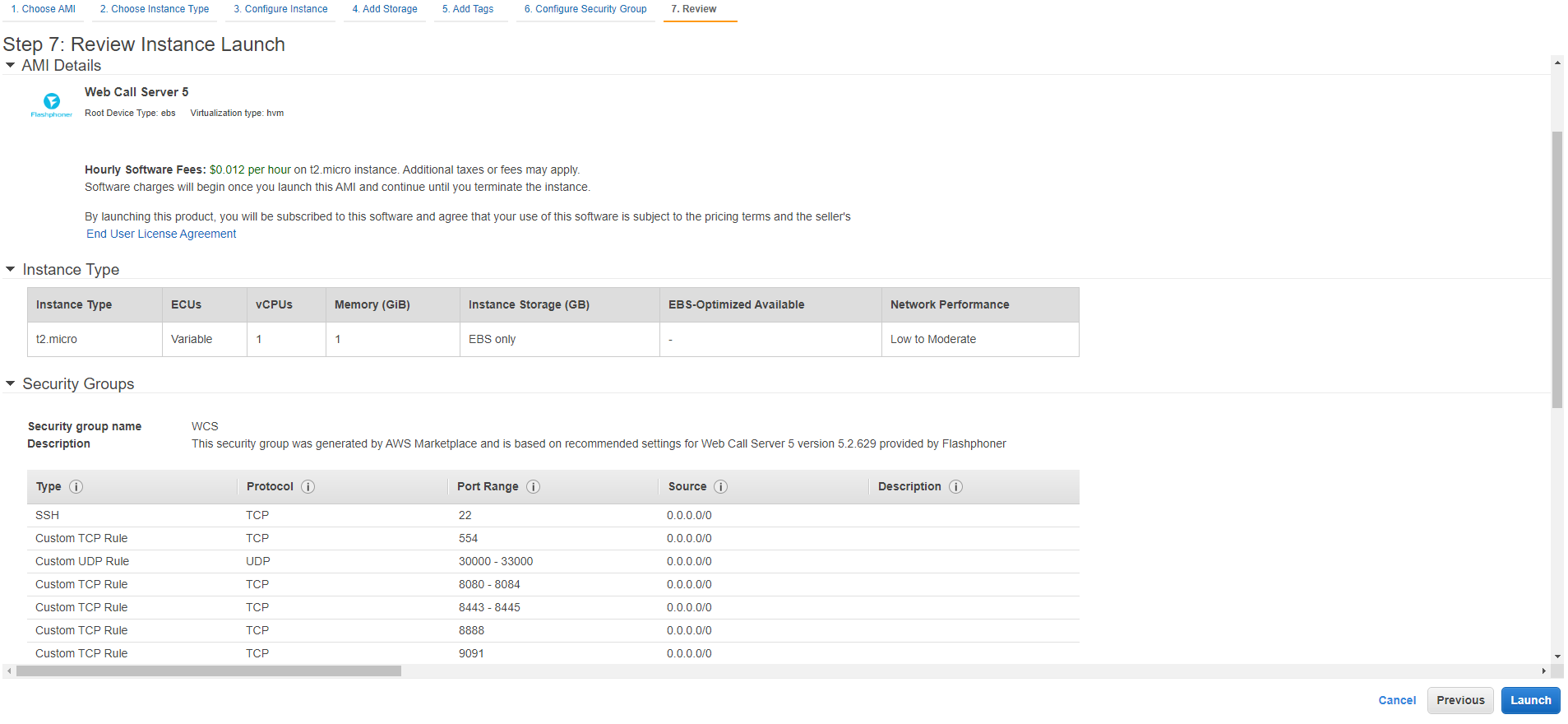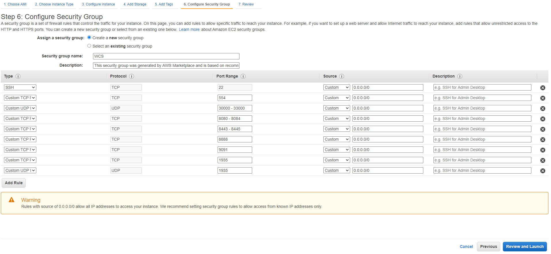 Configure security group. By default, the security group will be created from AMI settings. Add the necessary ports