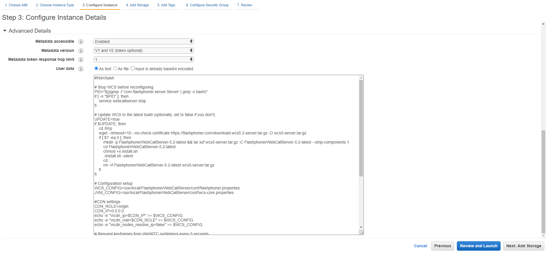 AWS Marketplace image contains only basic WCS settings. To customize the server, it is necessary to connect to the instance via SSH and restart WCS. However, to get ready to launch server "out of the box", it is possible to set up user script to reconfigure the server during the first start. This can be useful, for example, to deploy autoscaling group.