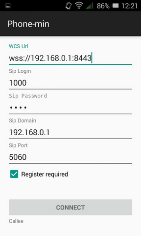 Install the Phone app to the Android device. Start the app, enter the URL of the WCS server to connect via Websocket and the data of the SIP account that receives the call: