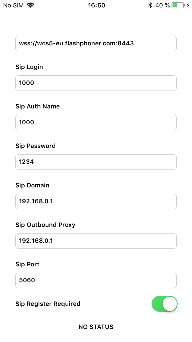 Build and install the Phone app to the iOS device. Start the app, enter the URL of the WCS server to connect to it via Websocket and the data of the SIP account making a call: