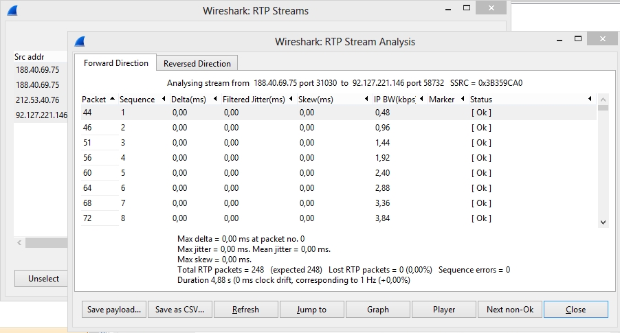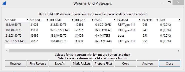 In this case, streams with SSRC 0x3B359CA0 and 0x1EC9BA4B are SRTP streams between the web browser and WCS, because the source and destination address is the IP address of the web client (we know it beforehand). The other two streams, specifically, the first and the third ones from the top, are RTP streams between WCS and the SIP server (we know addresses of the WCS server and the SIP server too).