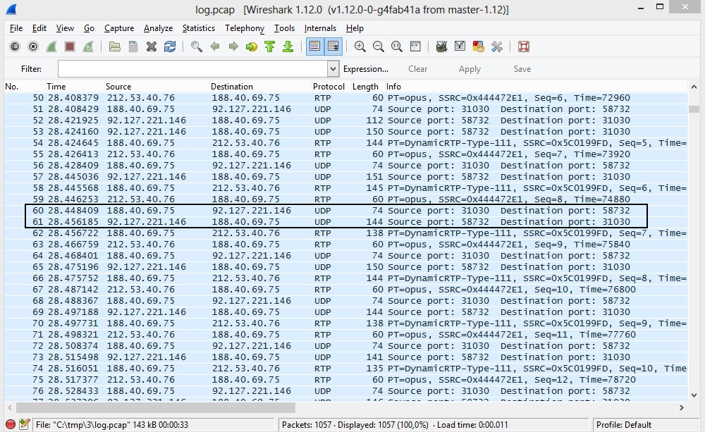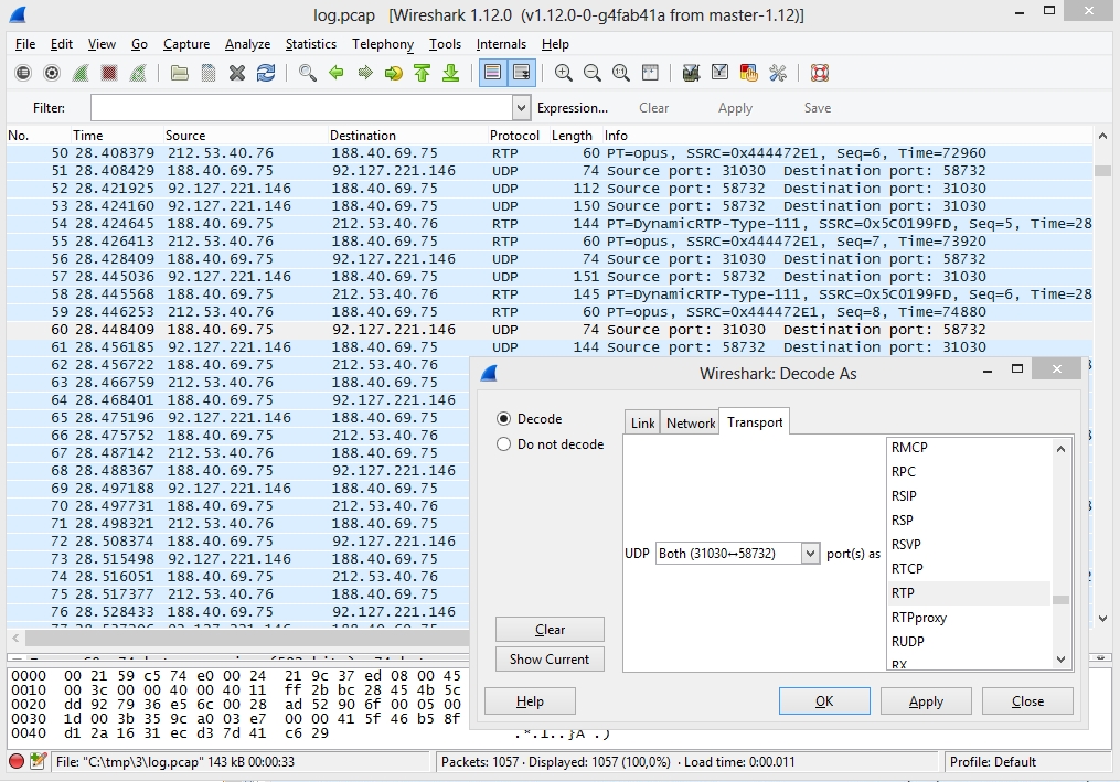 When the data are sent via SRTP, Wireshark cannot recognize SRTP packets. Finding this packets is easy enough. By default, WCS uses the following port range to transmit WebRTC media traffic: 31000-32000. In the dump we can see two unrecognized UDP packets, one of which is sent through the port 31030, and the second one is received to that port. For such packets, you should explicitly specify the protocol used