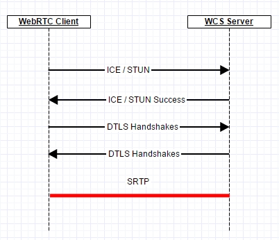 On the next stage, client and server exchange SSL certificates via DTLS and establish an encrypted channel between the web client and the WCS server. When the connection is established, SRTP traffic is transmitted.