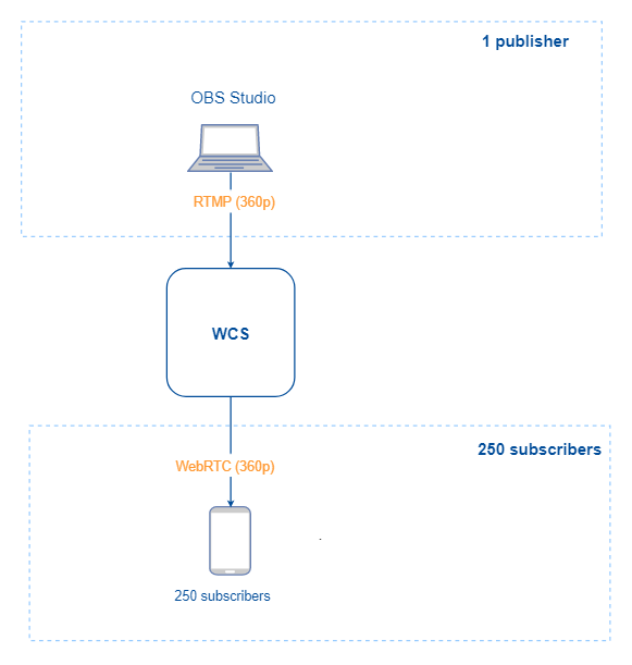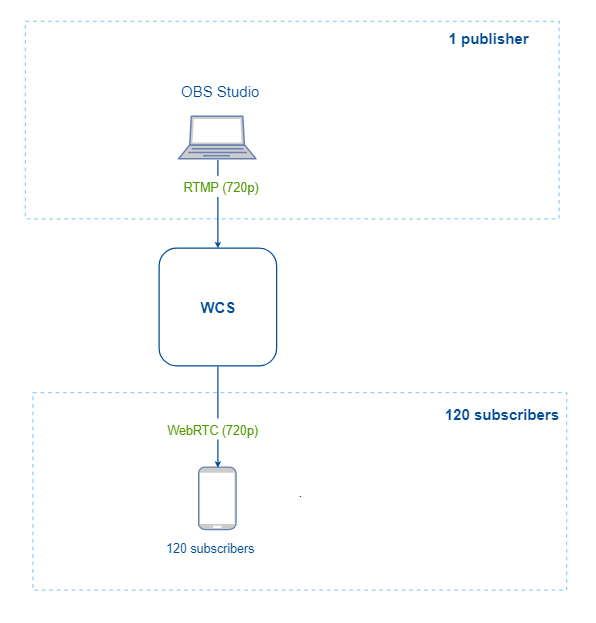 1. In this test, we’ll check how many viewers will be able to watch the broadcast without transcoding the stream on the server, i.e. we publish an RTMP stream with certain quality parameters from OBS Studio to the WCS server (an example shown in the documentation) and view it as subscribers