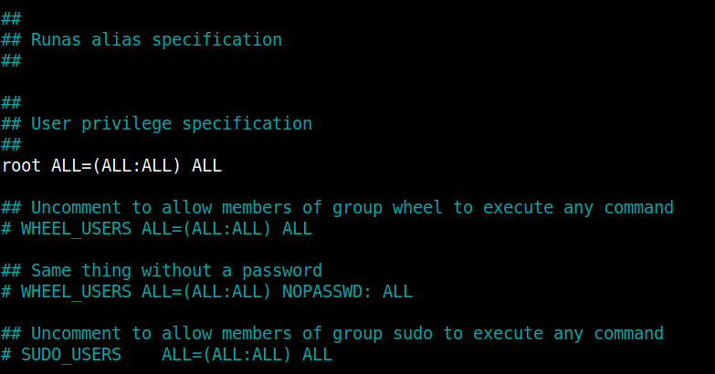 ... ## ## Runas alias specification ## ## ## User privilege specification ## # Uncomment the following line root ALL=(ALL:ALL) ALL ...