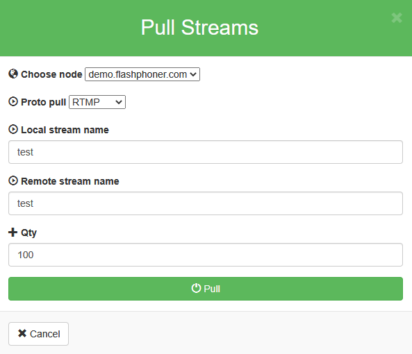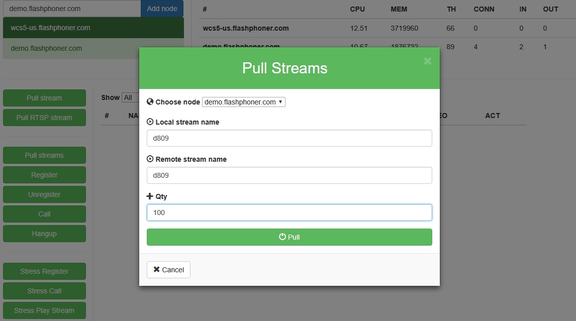 Consoleвыберите серверwcs5-us.flashphoner.com, нажмите кнопкуPull streams, задайте параметры теста:Choose node: выберите тестируемый серверdemo.flashphoner.comLocal stream name,Remote stream name: укажите имя опубликованного потокаQty: укажите количество зрителей (например,100)
