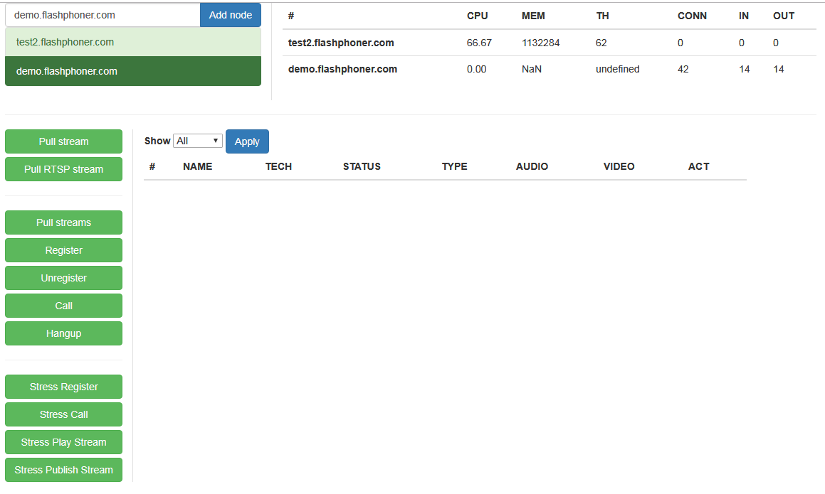 test2.flashphoner.comи нажмитеAdd node. Данный сервер будет тестироваться. Затем аналогично добавьте серверdemo.flashphoner.com, который будет выполнять роль подписчика, захватывая потоки