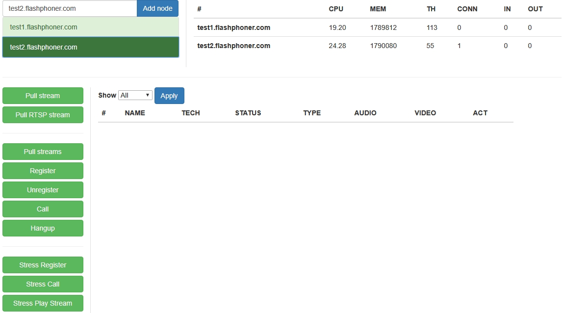 test1.flashphoner.comи нажмитеAdd node. Данный сервер будет проходить тест. Затем аналогично добавьте серверtest2.flashphoner.com, который будет создавать соединения с тестируемым сервером с требованием регистрации на SIP-сервере