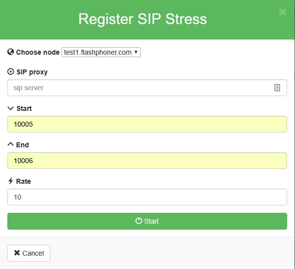 Consoleвыберите серверtest2.flashphoner.com, нажмите кнопкуStress register, задайте параметры регистрации на SIP-сервере:Choose node: выберите тестируемый серверtest1.flashphoner.comSip proxy: укажите имя SIP-сервераStart: укажите номер SIP-аккаунта, на который будут совершаться тестовые звонкиEnd: укажите номер последнего из SIP-аккаунтов, участвующих в тестированииRate: укажите частоту звонков