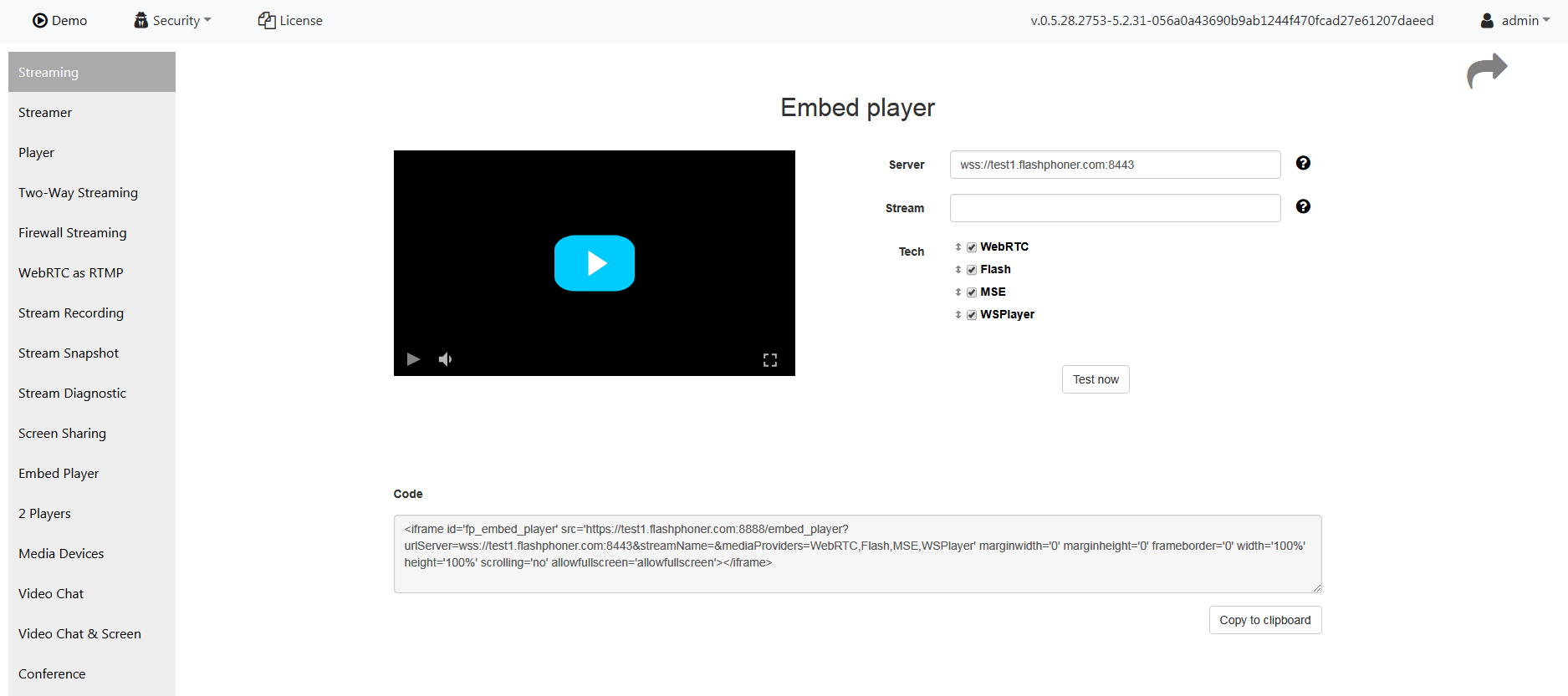 После авторизации, открывается веб-интерфейс WCS и приложение Embed Player