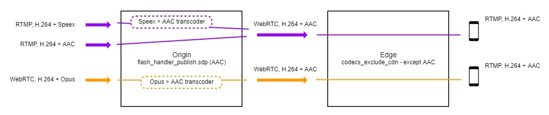 Например, с настройками по умолчанию (без flash_handler_publish.sdp) при публикации RTMP (AAC) на Origin и воспроизведении как WebRTC (Opus) на Edge в CDN