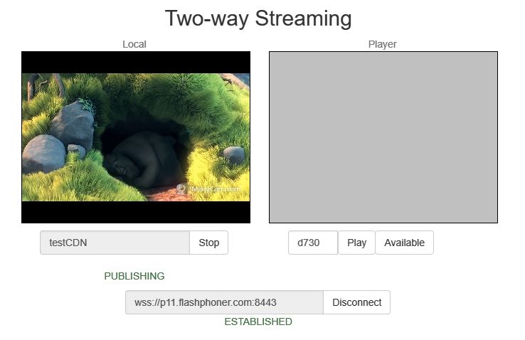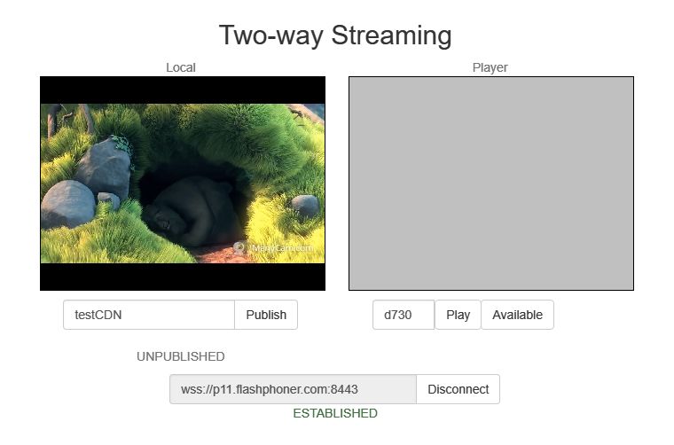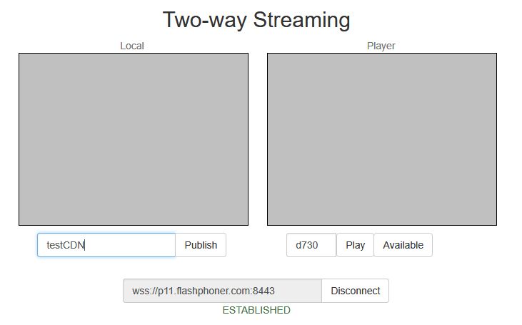 Откройте веб-приложение Two Way Streaming на Origin-сервере. Нажмите кнопку