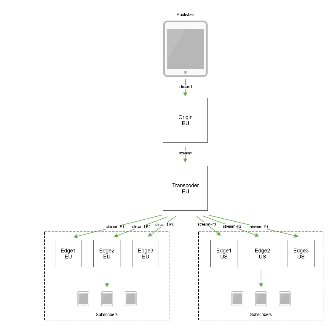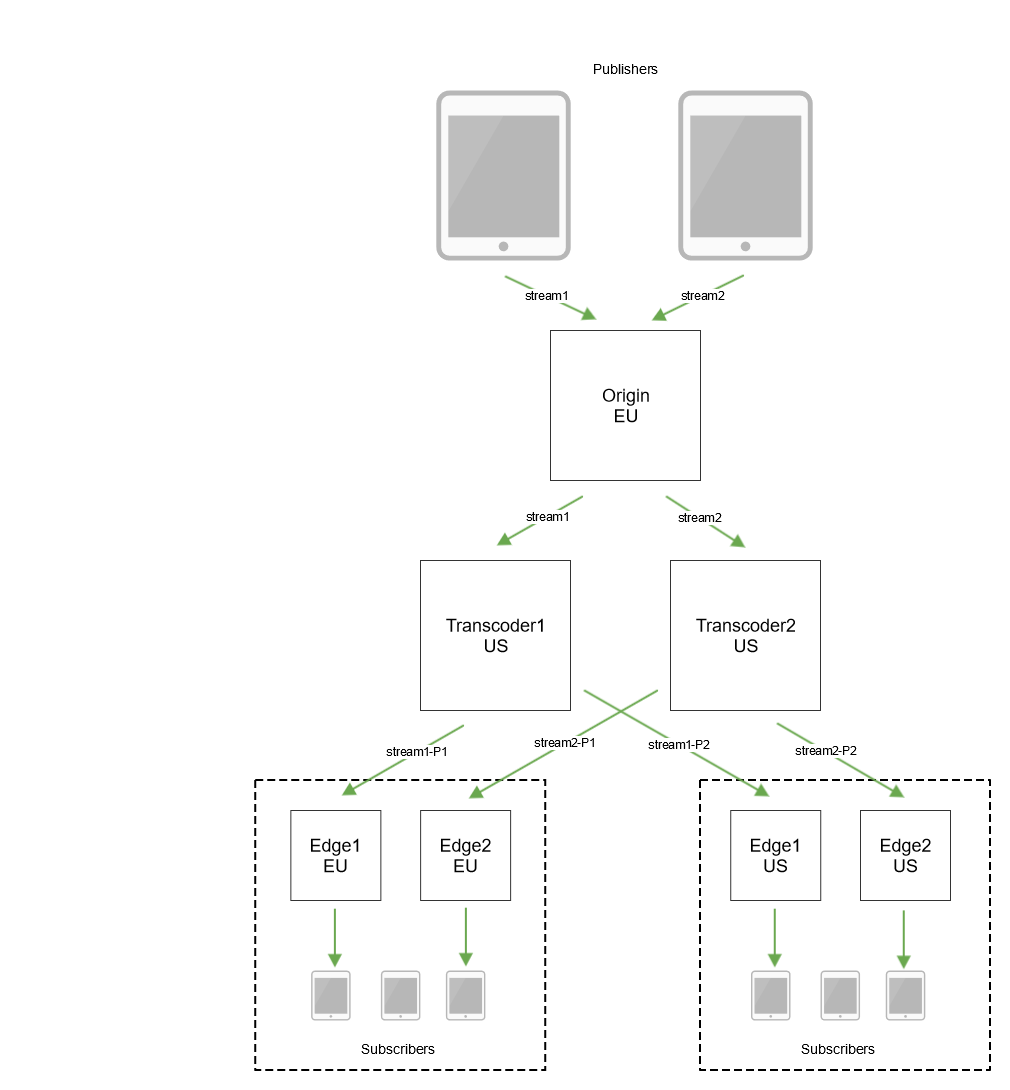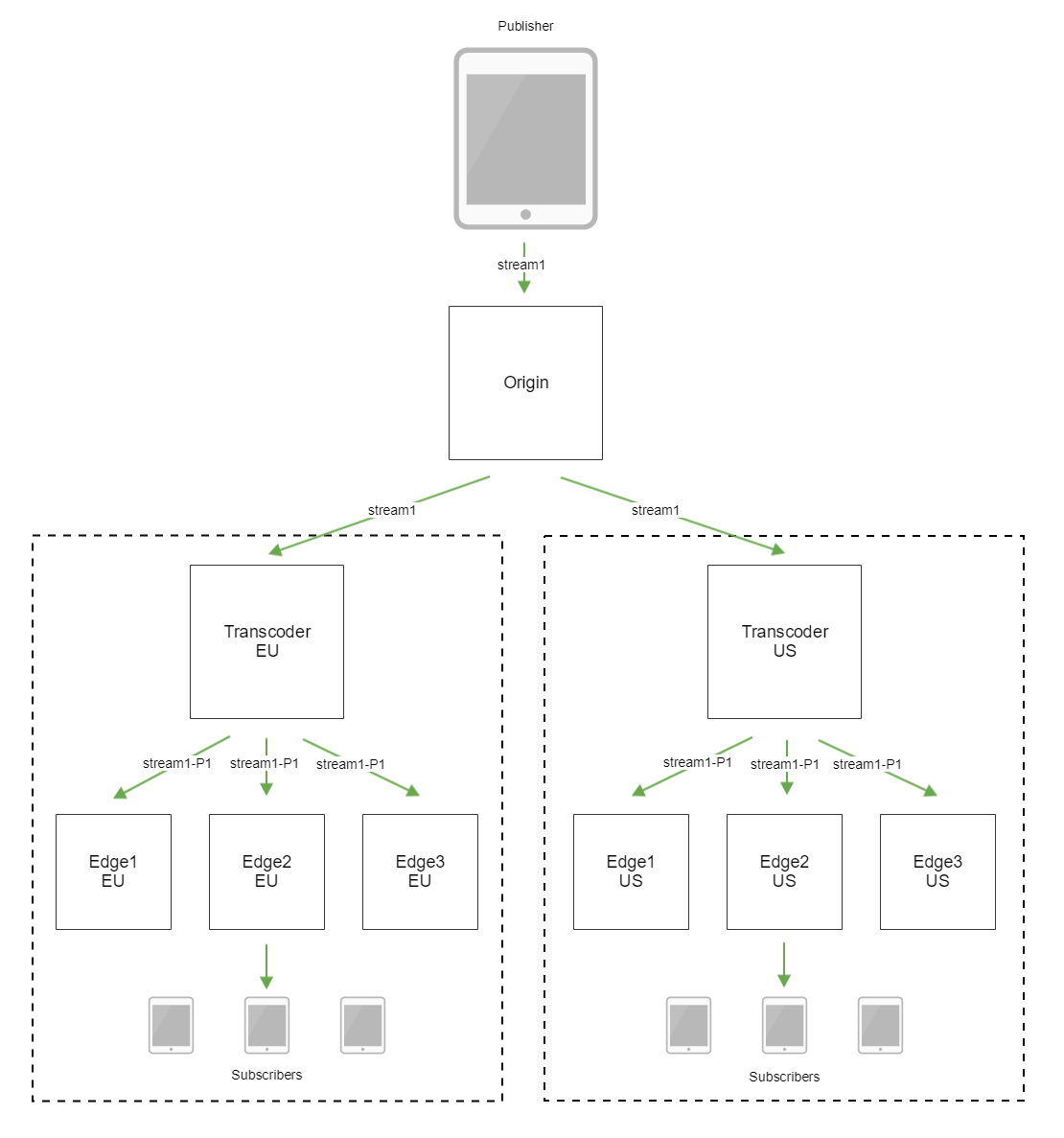 Узел Transcoder не должен использоваться для публикации или воспроизведения потока. Он взаимодействует с Origin и Edge серверами следующим образом: