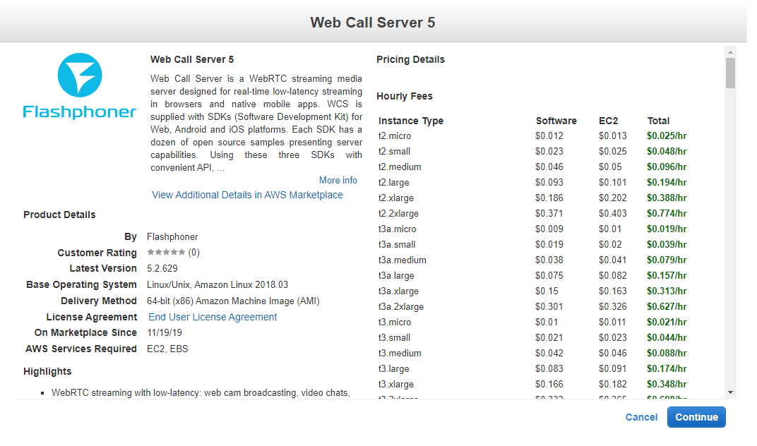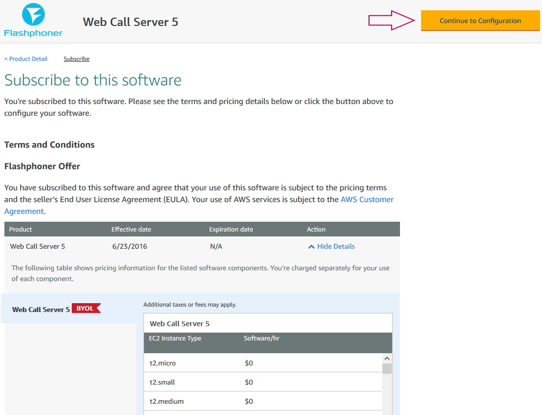 1. Откройте страницу Web Call Server на Amazon AWS Marketplace, нажмите Continue to Subscribe: