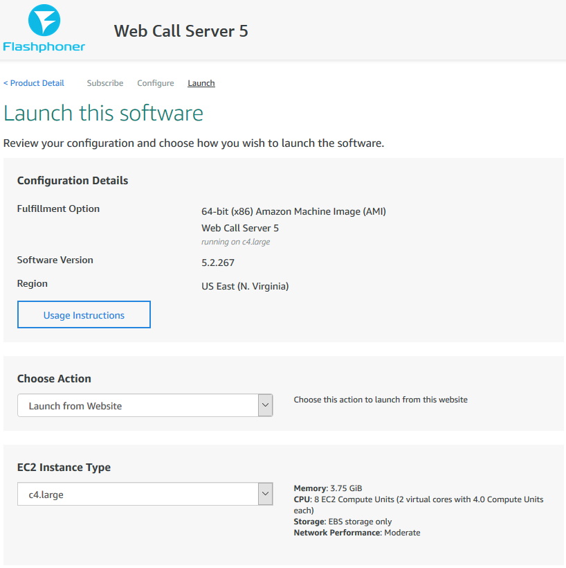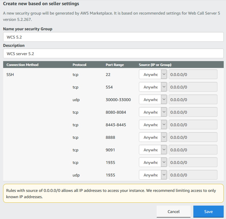 Готовый образ WCS на AWS Marketplace содержит лишь базовые настройки. Для изменения настроек необходимо зайти по SSH в созданный экземпляр сервера и перезапустить WCS. Для получения готового к работе экземпляра "из коробки" можно указать пользовательский скрипт для изменения настроек при первом запуске сервера. Эта возможность полезна, например, при развертывании группы масштабирования.