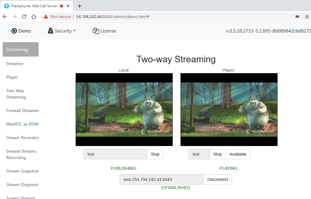 8. Откройте веб интерфейс сервера, опубликуйте поток в примере Two Way Streaming и проиграйте его