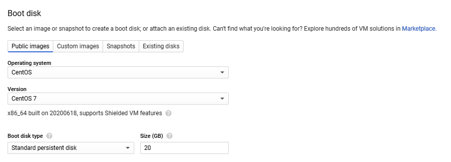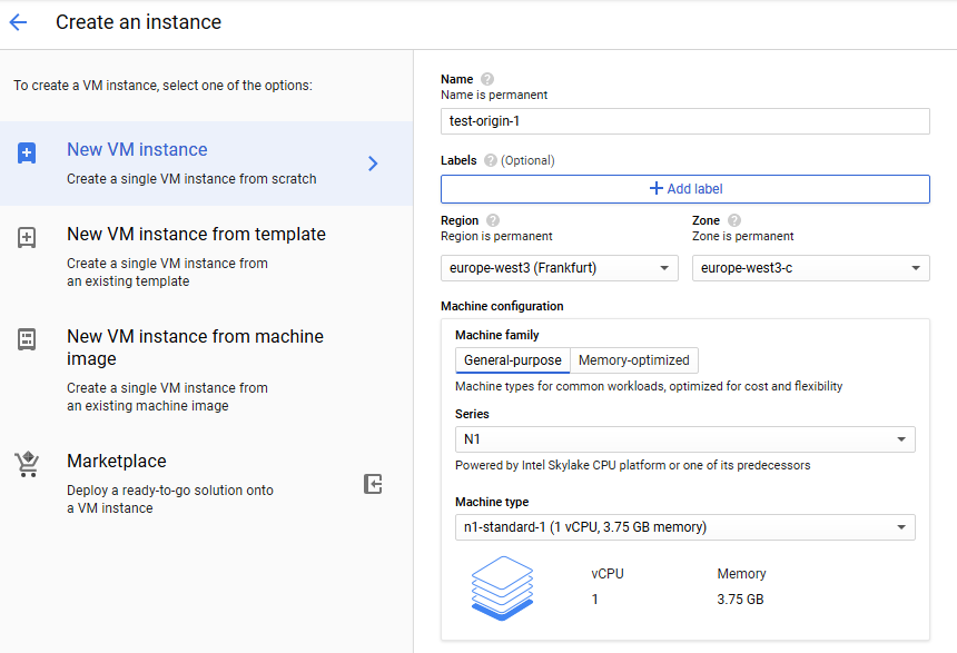 Compute Engine-VM instancesи нажмитеCreate VM instance, чтобы начать создание экземпляра сервера. Выберите имя сервера, регион и зону расположения датацентра, а также конфигурацию сервера