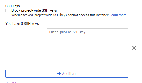 Securityдобавьте публичный ключ для доступа к серверу по SSH, если у Вас нет ключей, привязанных к проекту
