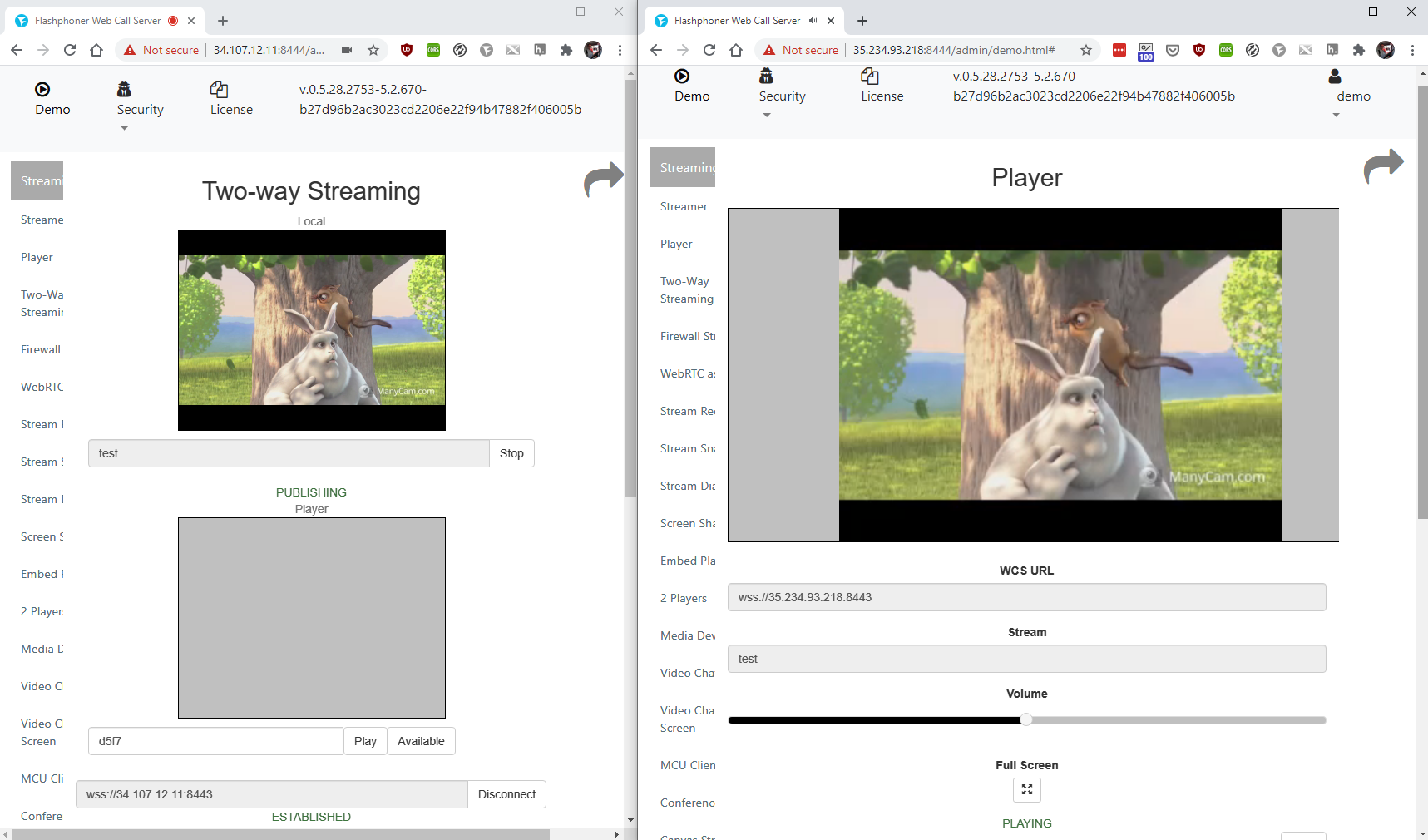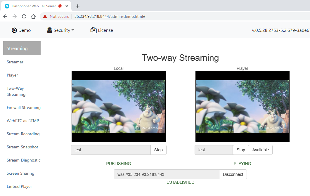 Войдите в веб-интерфейс сервера, откройте пример Two Way Streaming, опубликуйте и проиграйте поток