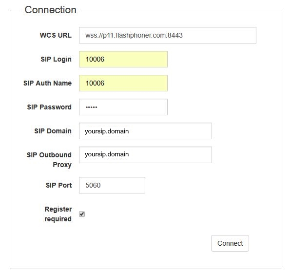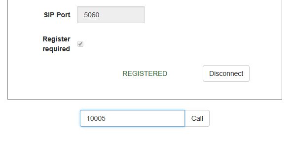 4. Нажмите в браузере кнопку Connect, будет установлено соединение с сервером. Затем введите идентификатор SIP-аккаунта, принимающего звонок, и нажмите кнопку Call: