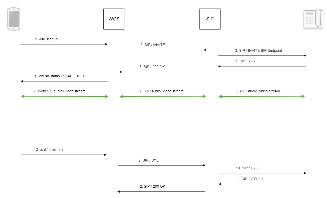 Web Call Server поддерживает аудио и видеозвонки из браузера на SIP устройства, PBX серверы, SIP-GSM-шлюзы, VoIP конференции и другие устройства с поддержкой протокола SIP. Таким образом, веб-приложение в браузере может работать, как программный телефон с поддержкой протокола SIP, принимать и инициировать голосовые и видеозвонки.