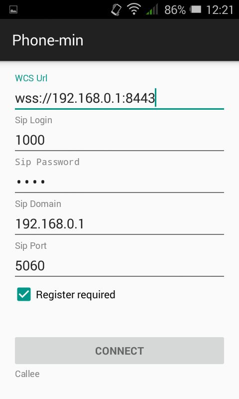 Установите на Android-устройство приложение Phone. Запустите приложение, введите URL WCS-сервера для подключения к нему по Websocket и данные SIP-аккаунта, принимающего звонок: