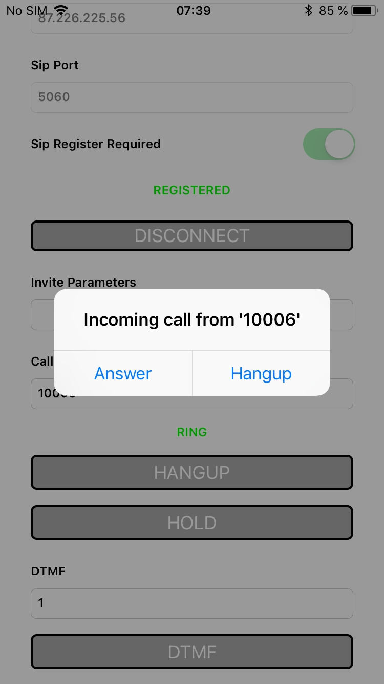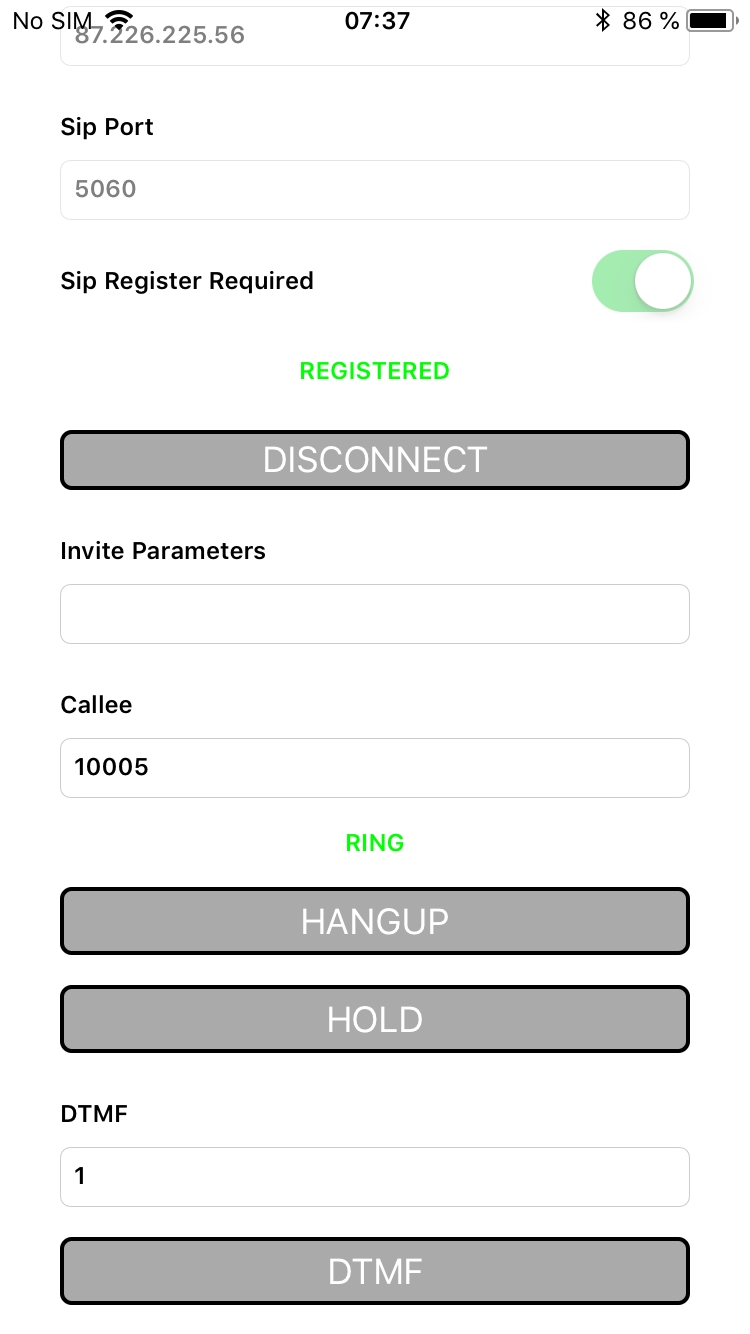 Соберите и установите на iOS-устройство приложение Phone. Запустите приложение, введите URL WCS-сервера для подключения к нему по Websocket и данные звонящего SIP-аккаунта: