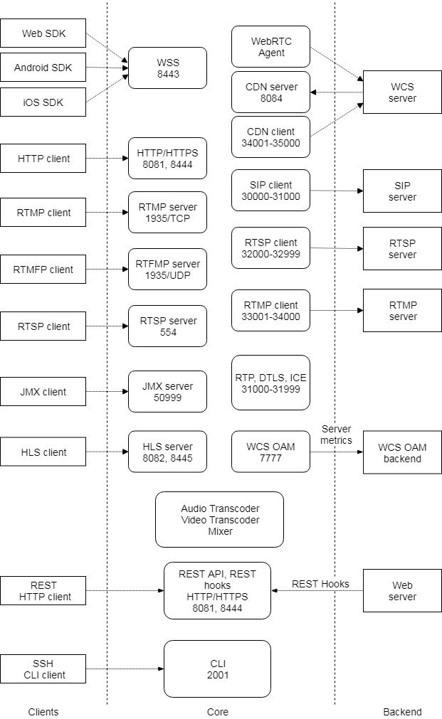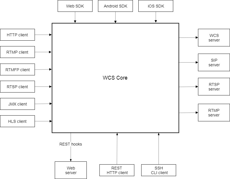 WCS работает под управлением операционной системы Linux x86_64. Сетевая архитектура WCS представлена на рисунке выше и имеет один основной модуль: