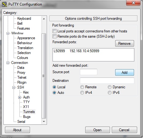 Это все. Теперь все вызовы на localhost:50999 будут перенаправляться на сервер 192.168.10.4 в безопасном соединении по созданному SSH-тунелю.