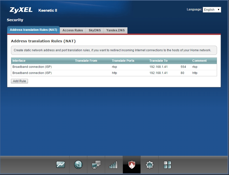 Здесь 192.168.1.41 - это IP адрес камеры в локальной сети. Маршрутизатор говорит, что при обращении на данные порты он будет перенаправлять RTSP запросы IP-камере.