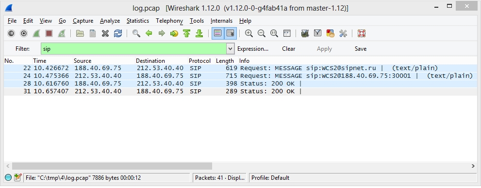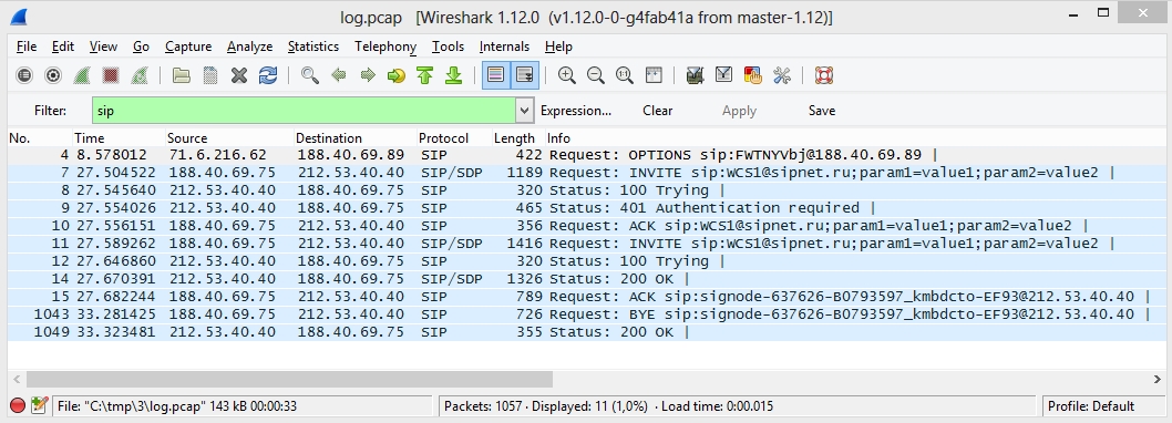Webphone по умолчанию пытается зарегистрироваться на SIP сервере. На примере дампа SIP трафика ниже вы можете увидеть как проходит процесс успешной SIP-регистрации. Дамп отфильтрован по sip протоколу