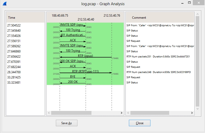Wireshark позволяет анализировать отдельные SIP звонки в меню: 'Telephony - VoIP Calls - Flow'. Ниже пример анализа исходящего звонка на основе дампа. Анализ звонка показывает, что от SIP-сервера был получен 251 RTP пакет в кодеке Opus, а отправлено 248 аудио пакетов