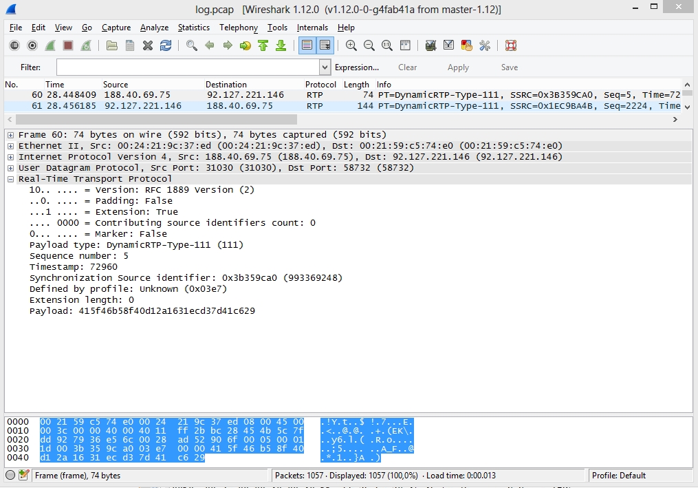 В результате декодирования протокола, Wireshark отобразит разобранный SRTP трафик:
