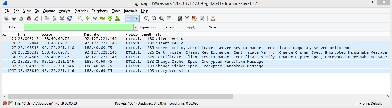 Следующим шагом происходит обмен SSL сертификатами через DTLS и установка зашифрованного канала между Web-клиентом и WCS-сервером. После того, как соединение установлено, начинает идти SRTP-трафик.